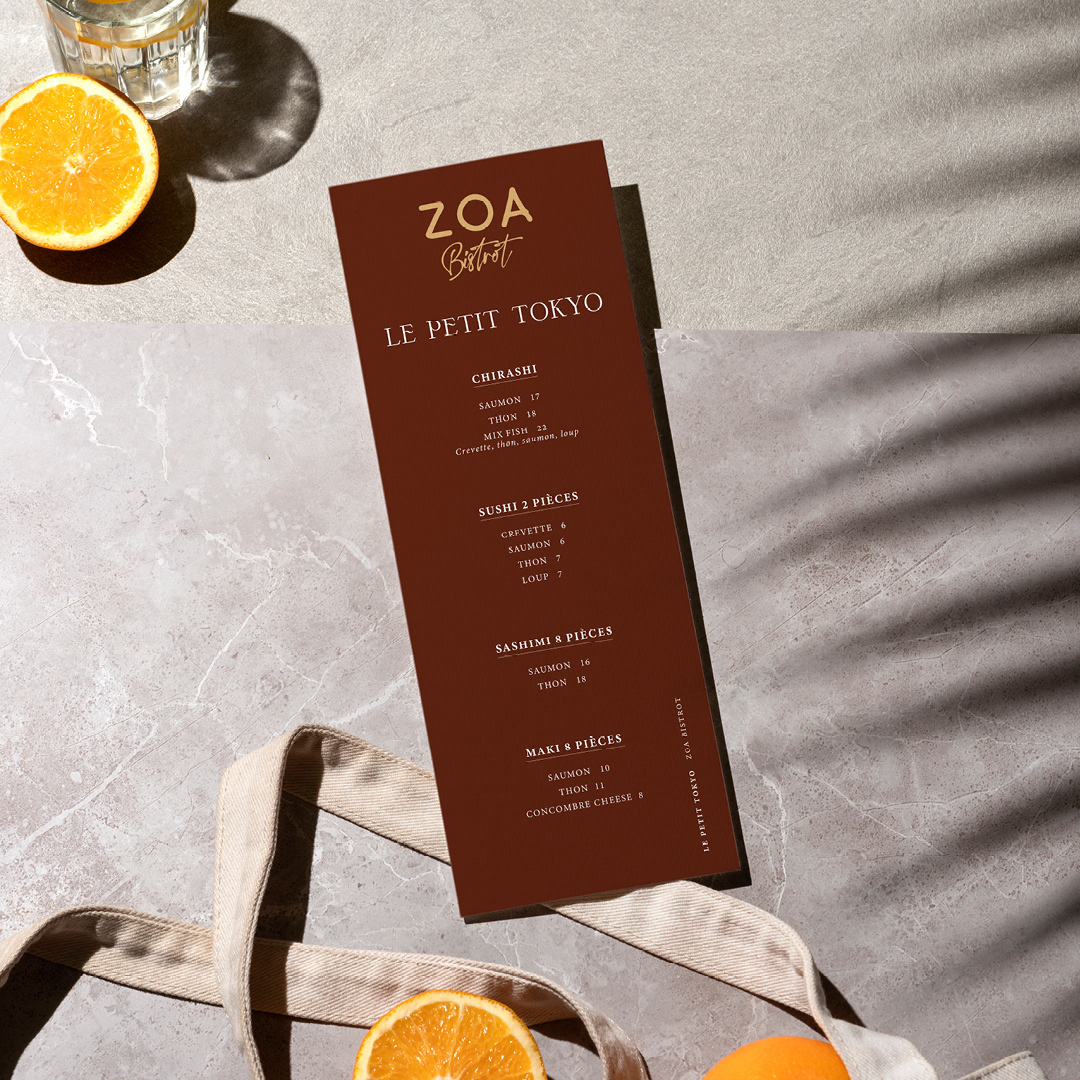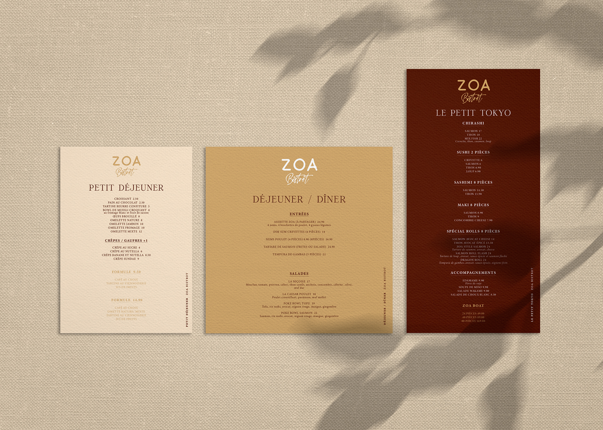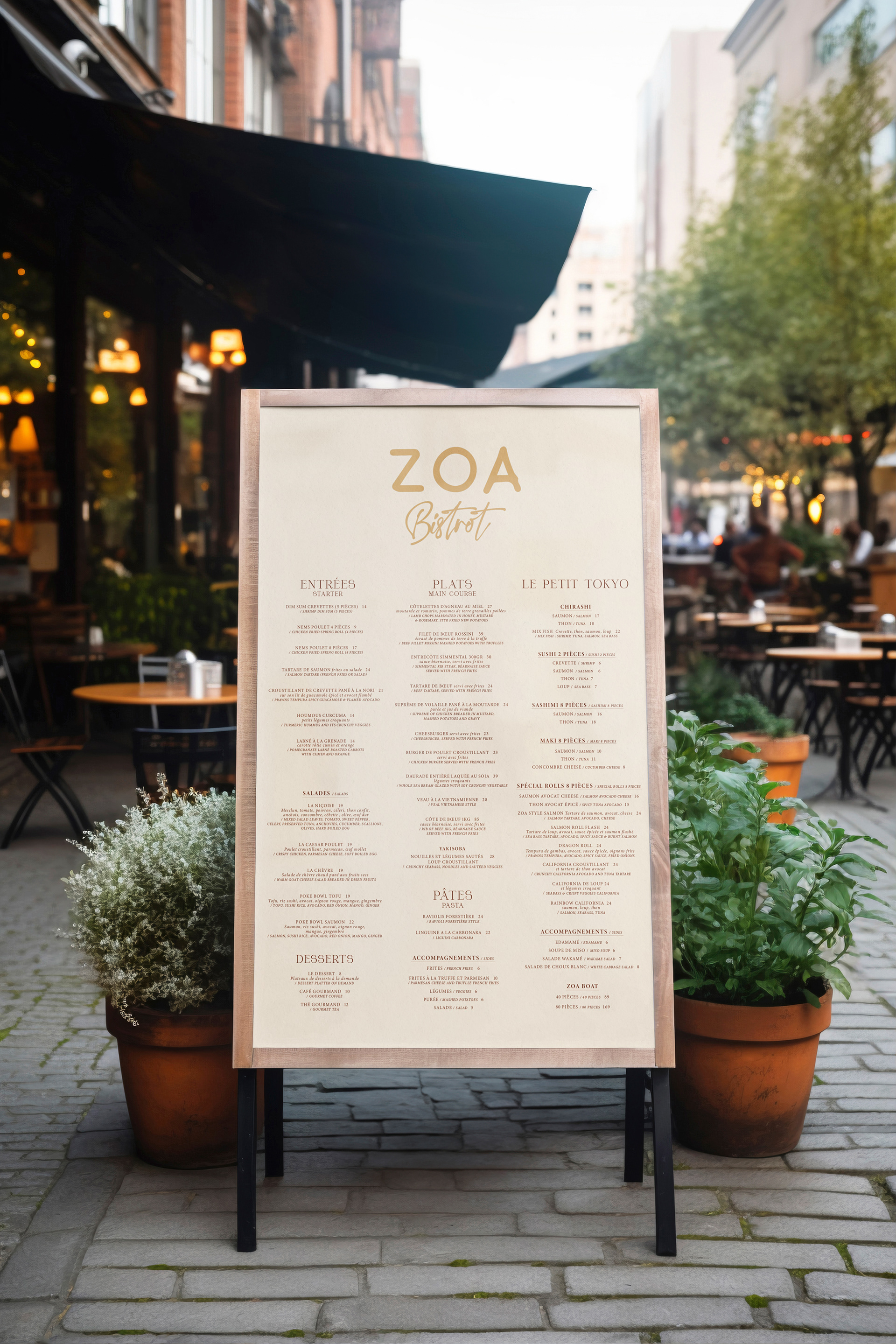 Création des cartes et panneaux pour le restaurant le Zoa Bistrot à Cannes.
