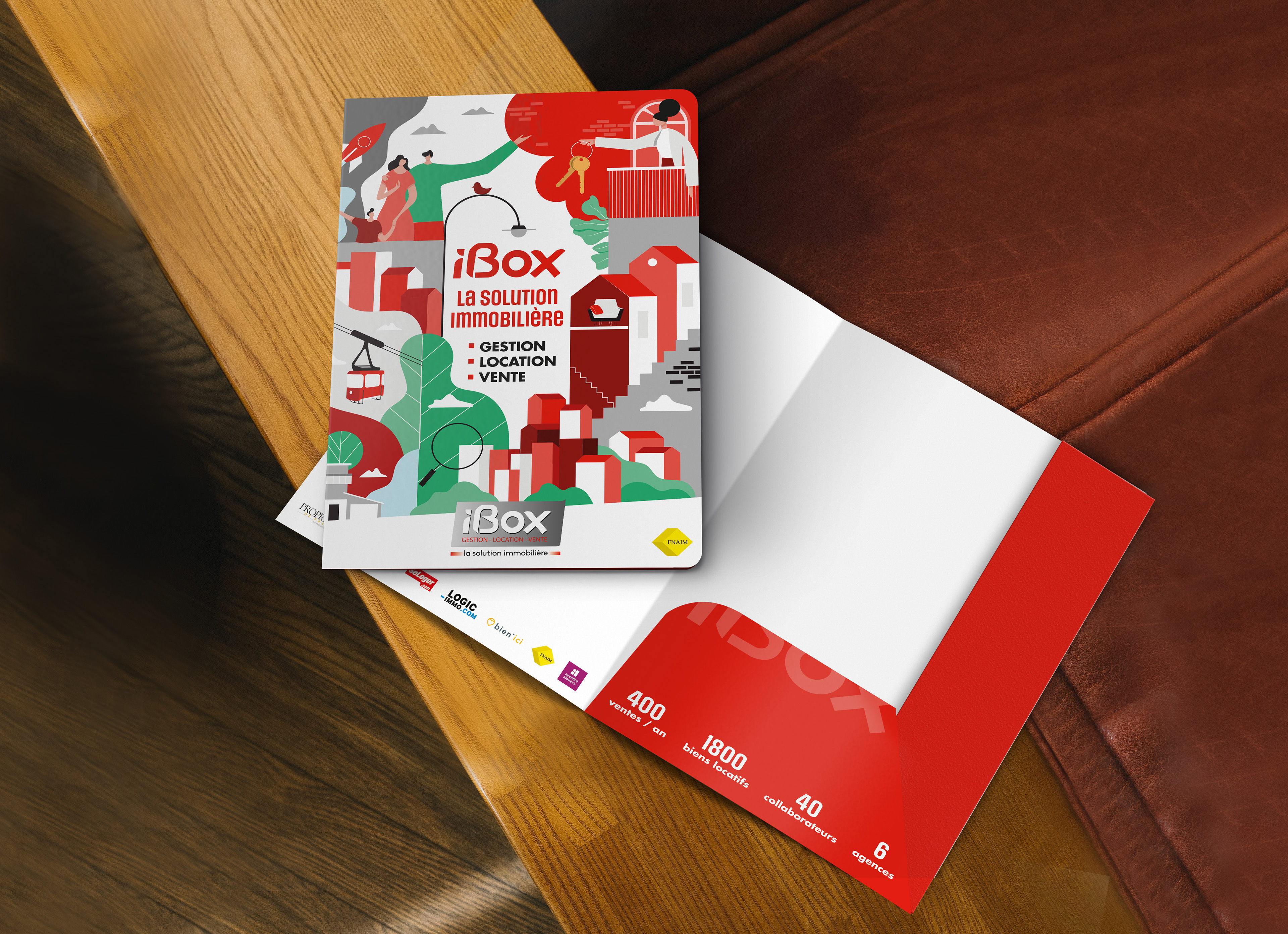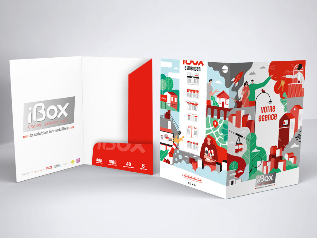 Création pochette à rabat illustrée pour le groupe d'agences immobilières iBox, situé dans le département du var.