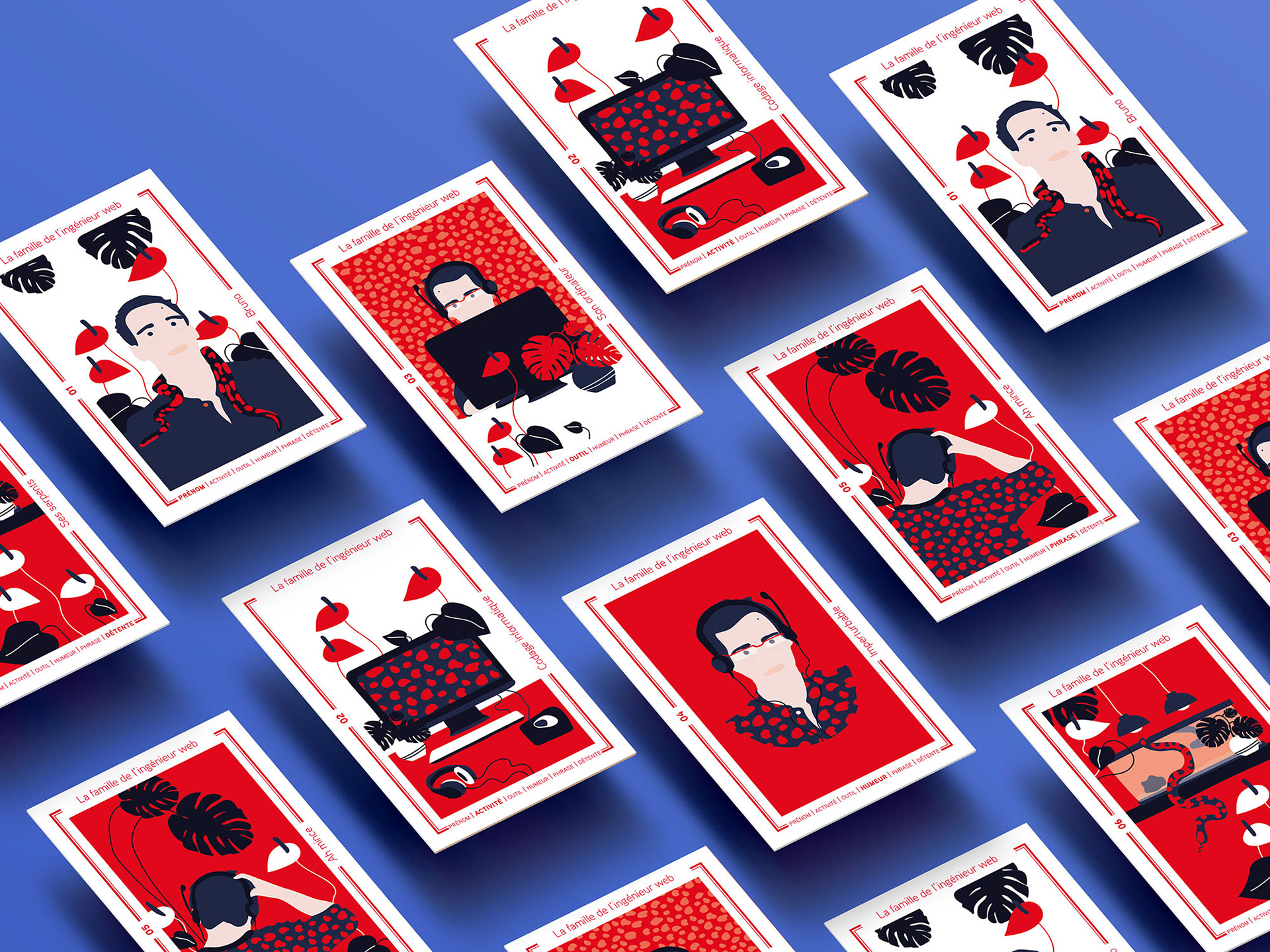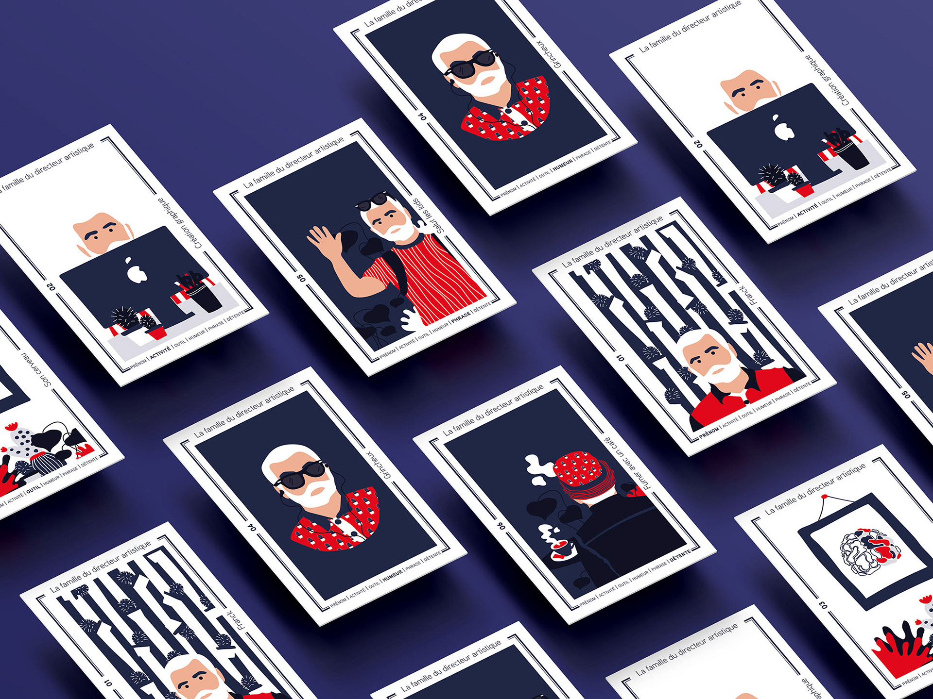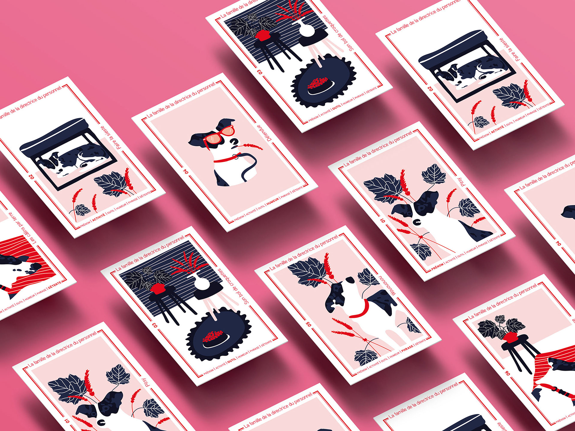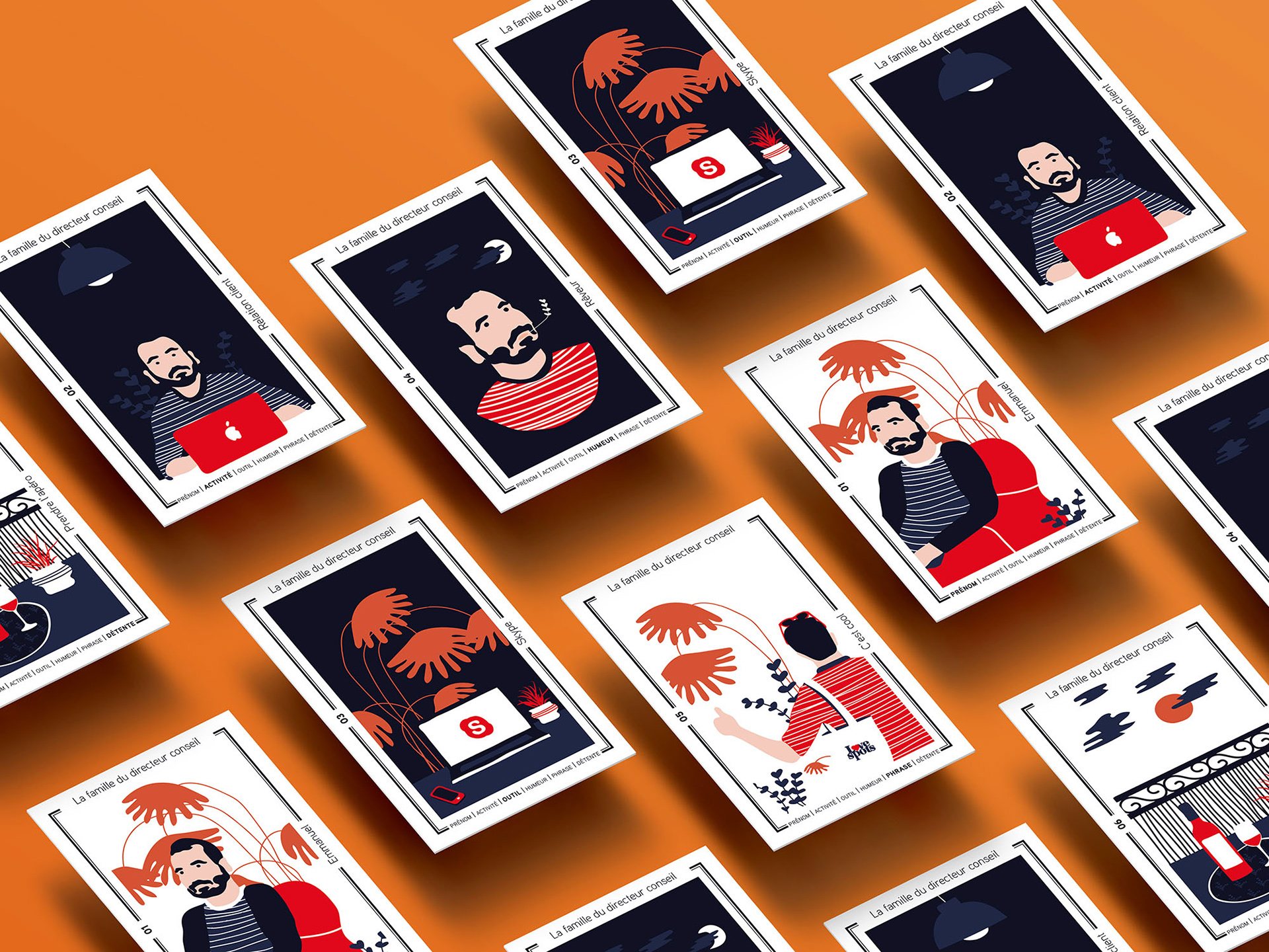 Création d'un jeu complet des 7 familles pour présenter les 7 membres de l'équipe de l'agence de communication La langue du Caméléon, à Nice.