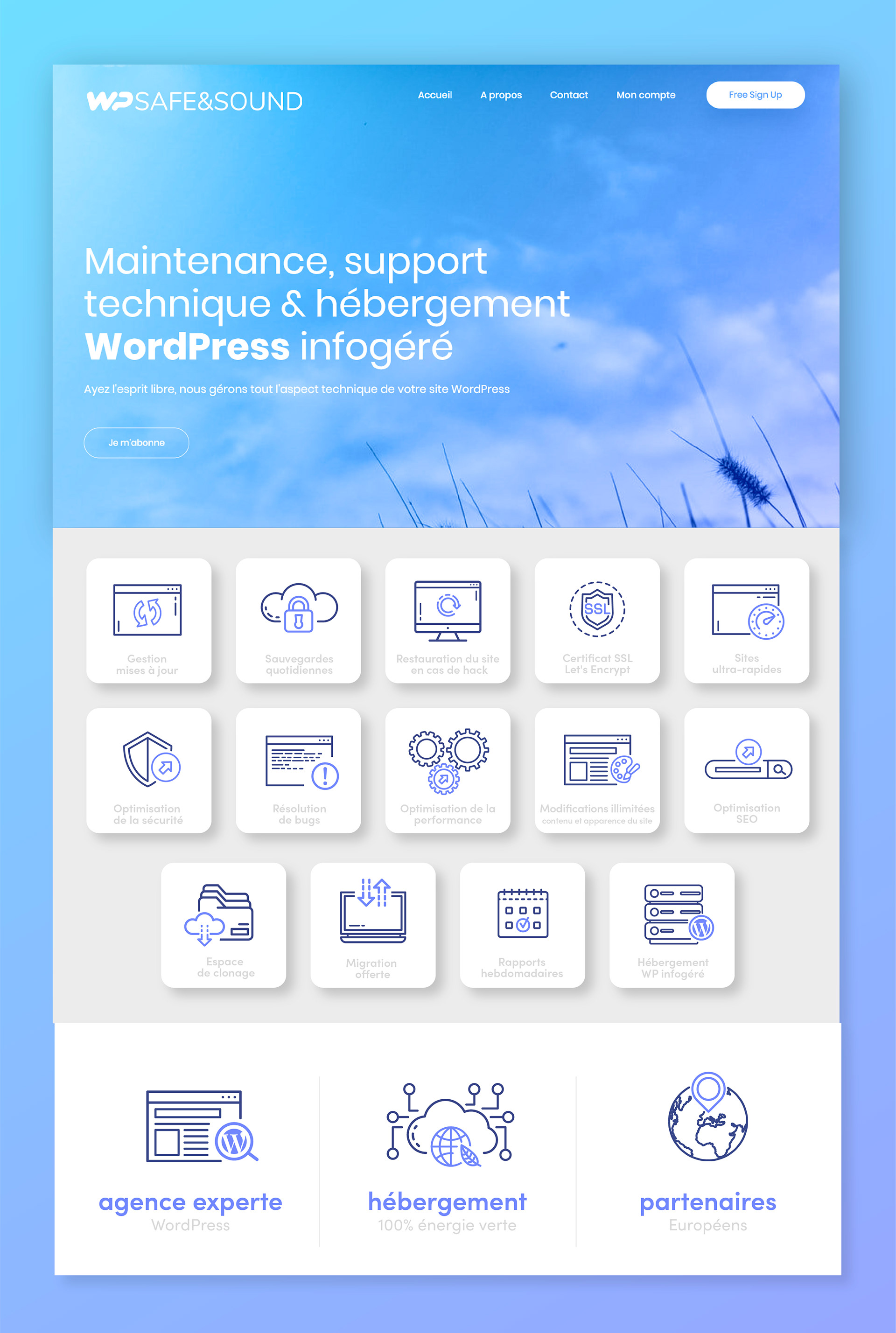Création logotype et icônes pour les site internet WP Safe & Sound, plateforme de maintenance et hébergement pour sites Wordpress.